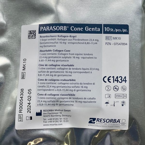 Conurile de colagen cu gentamicină GENTA-COLL de la Resorba sunt resorbabile și sunt utilizate pentru hemostază și protecție antibiotică în procedurile chirurgicale. Acestea sunt ideale pentru controlul sângerării și prevenirea infecțiilor în urma extracțiilor dentare și altor intervenții chirurgicale cu risc crescut de infecție.