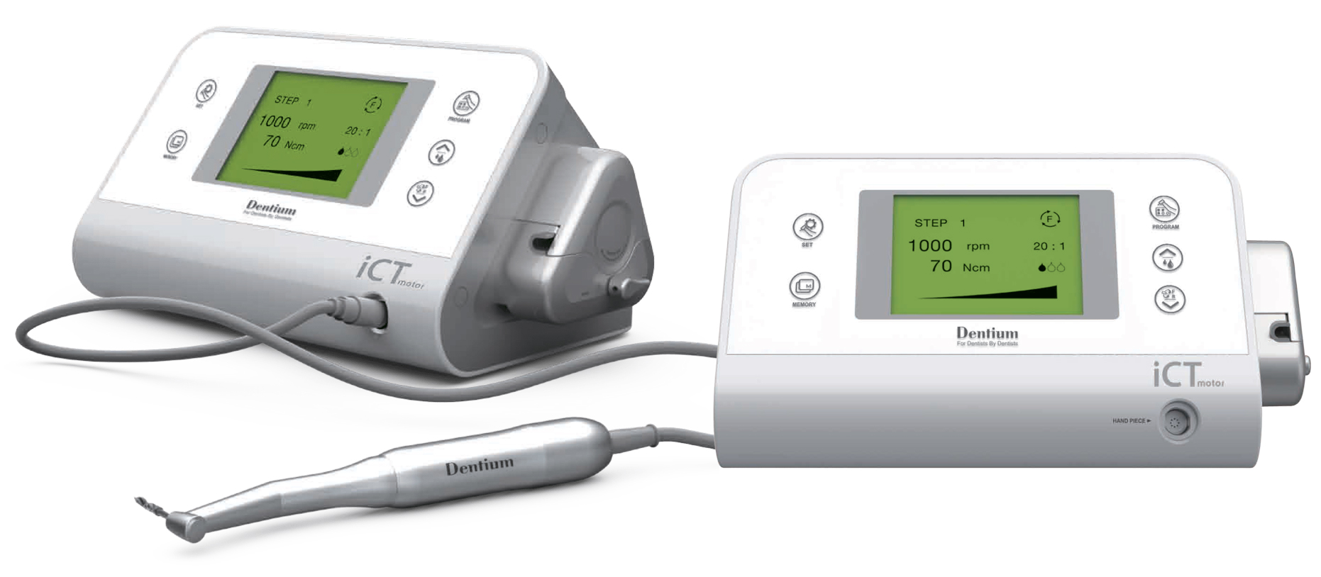 iCT Motor face parte din gama de fiziodispensere Dentium dedicate implantologiei moderne. Cu un motor electric de înaltă precizie și un sistem de control cu fir, acest dispozitiv asigură o funcționare sigură și stabilă în toate etapele intervenției — de la forajul inițial până la inserarea finală a implantului. Unitatea de bază compactă oferă o ieșire de putere automată, menținând un cuplu constant chiar și la viteze reduse. Afișajul digital arată simultan viteza de rotație (RPM) și cuplul aplicat (N·cm), iar utilizatorul poate selecta parametrii optimi pentru fiecare etapă chirurgicală.